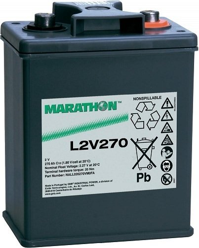 | Description: | AGM battery 2V 270Ah (C10), sealed, maintenance free, (12+ years), measurements: 209x136x283mm, M8 thread, weight ca.18.3kg |